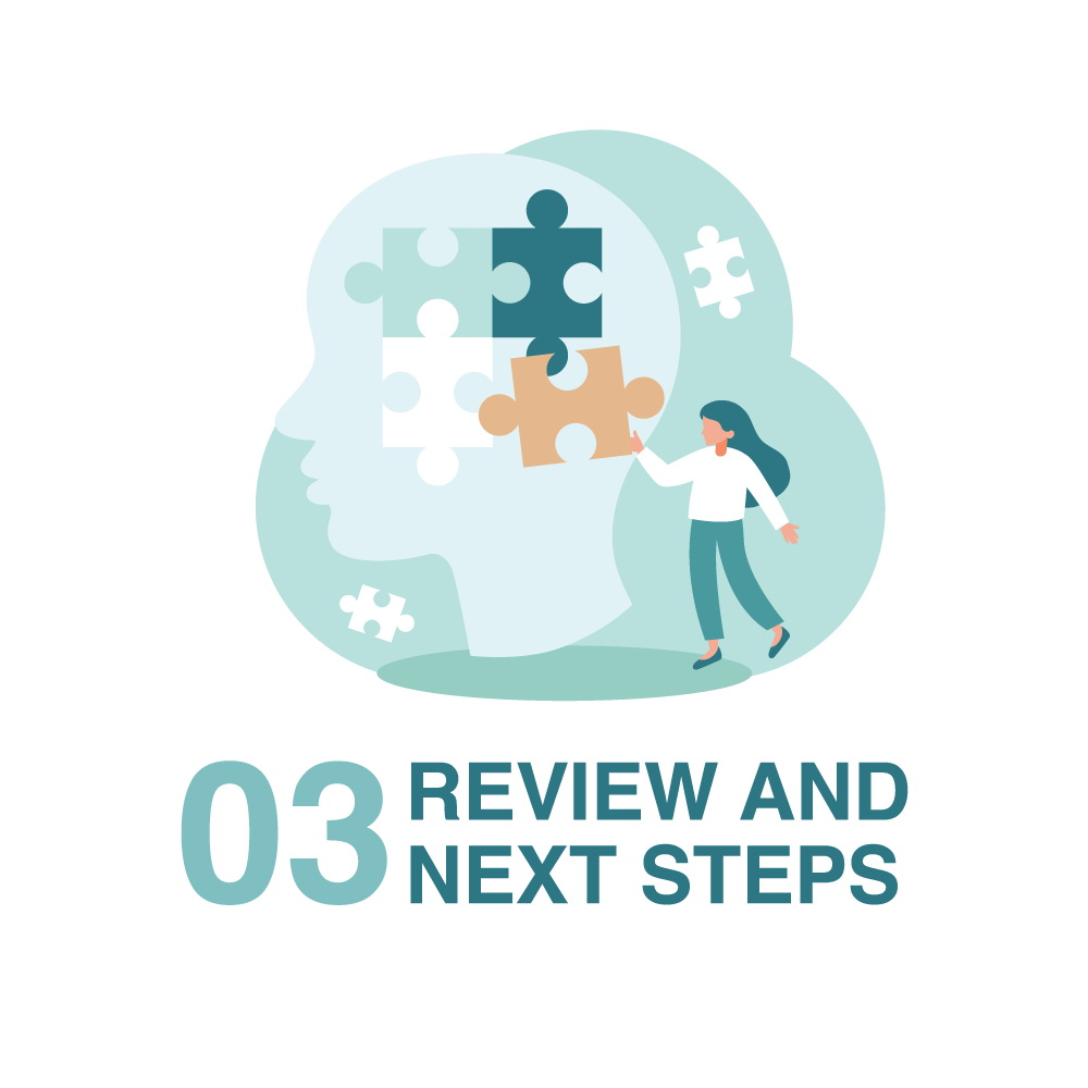 The Therapist discusses what’s working well, what still feels challenging, and possible next steps. These may include: